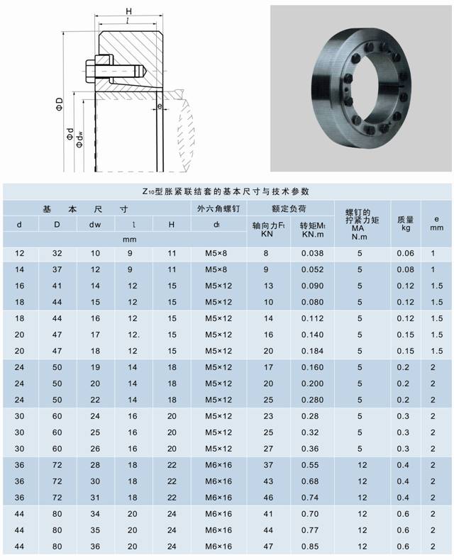 脹緊聯(lián)結(jié)套是一種近代新型Xian進(jìn)的機(jī)械基礎(chǔ)件。脹套是當(dāng)今 廣泛用于實(shí)現(xiàn)機(jī)件和軸聯(lián)結(jié),靠擰緊12.9級(jí)高強(qiáng)度螺釘使包容面間產(chǎn)生的壓力和摩擦力來(lái)實(shí)現(xiàn)負(fù)荷傳遞的一種新型無(wú)鍵聯(lián)結(jié)裝置。 脹套這與一般過(guò)盈聯(lián)結(jié)、有鍵聯(lián)結(jié)相比,脹套聯(lián)結(jié)具有許多 的優(yōu)點(diǎn)。