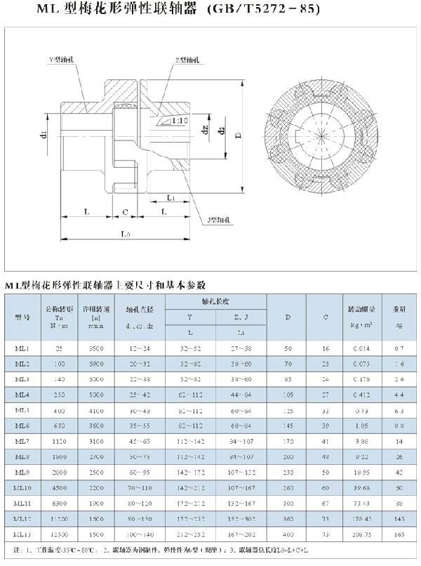 ML1梅花彈性蛇形聯(lián)軸器主要由兩個帶凸齒密切嚙合并承受徑向擠壓以傳遞扭矩,當兩軸線有相對偏移時,彈性元件發(fā)生相應(yīng)的彈性變形,起到自動補償作用。 ML1梅花蛇形聯(lián)軸器主要適用于起動頻繁、正反轉(zhuǎn)、中高速、中等扭矩和要求高可靠性的工作場合,工作環(huán)境溫度-35℃~+80℃,傳遞公稱扭矩25~12500Nm,許用轉(zhuǎn)速1500~15300r/min。